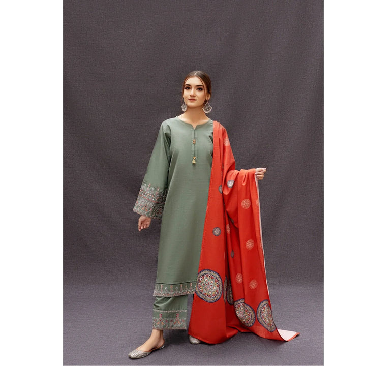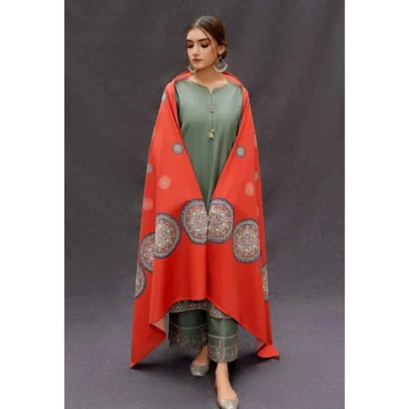 Dyed Dhanak Shirt✨ Embroidered Daman Patch✨ Embroidered Sleeves Patch✨ Dyed Trouser with Embroidered Lace✨ Embroidered Shawl